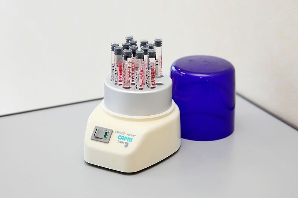 人の体は温度差にも敏感で、組織の瞬間的な拒絶反応から痛みなどを感じやすくなります。当院では、麻酔液を温める専用器具を使用し、人肌に調整した麻酔液を注入する事で、温度差で生じる痛みを緩和しています。