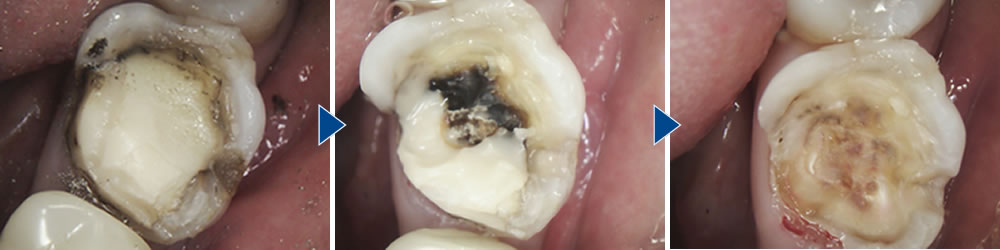 銀歯を除去したところ、内部に虫歯が認められました。虫歯部分を丁寧に取り除き、できるだけ健全な歯質を残すように処置を行いました。