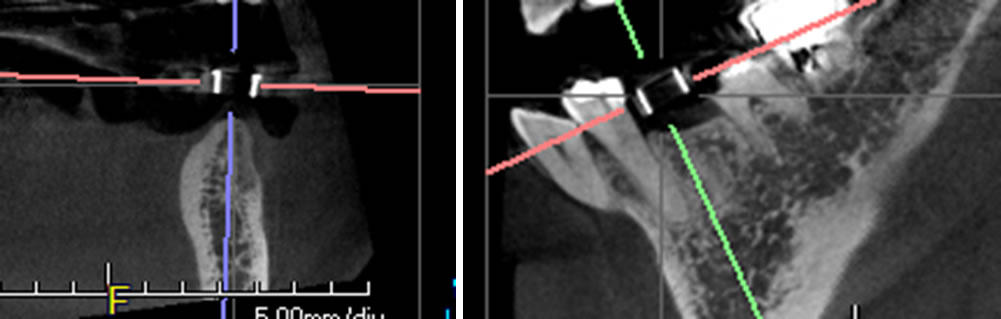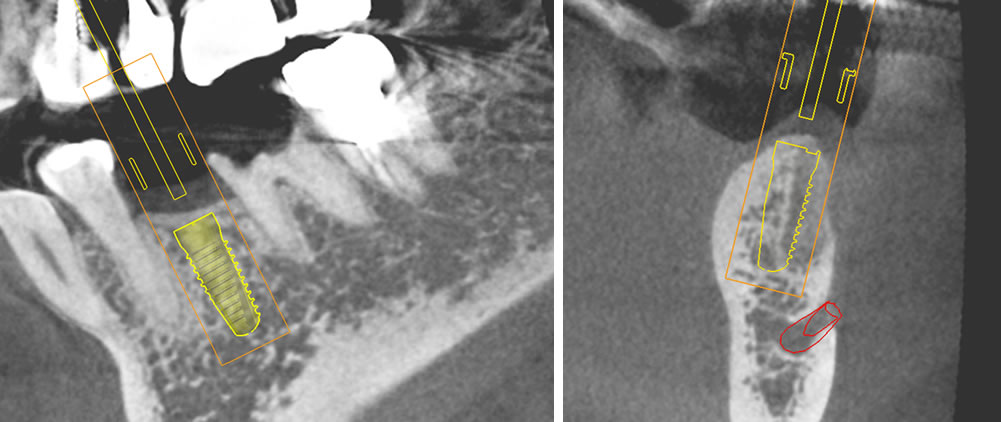 事前にシミュレーションを行い、適切なサイズのインプラントを選択しました。また、大切な神経から十分な距離を確保できることを確認し、安全に治療が行えると判断しました。