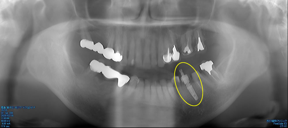 治療から2年以上経過していますが、レントゲン検査でも骨の状態に異常は認められていません。歯茎の腫れや炎症もなく、インプラントは良好に機能しています。